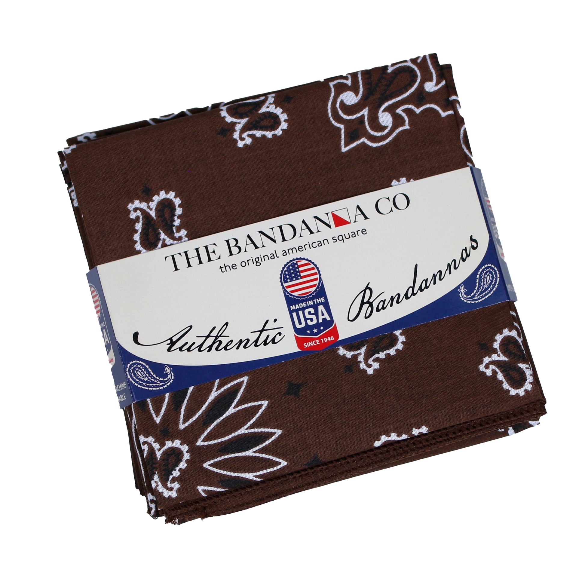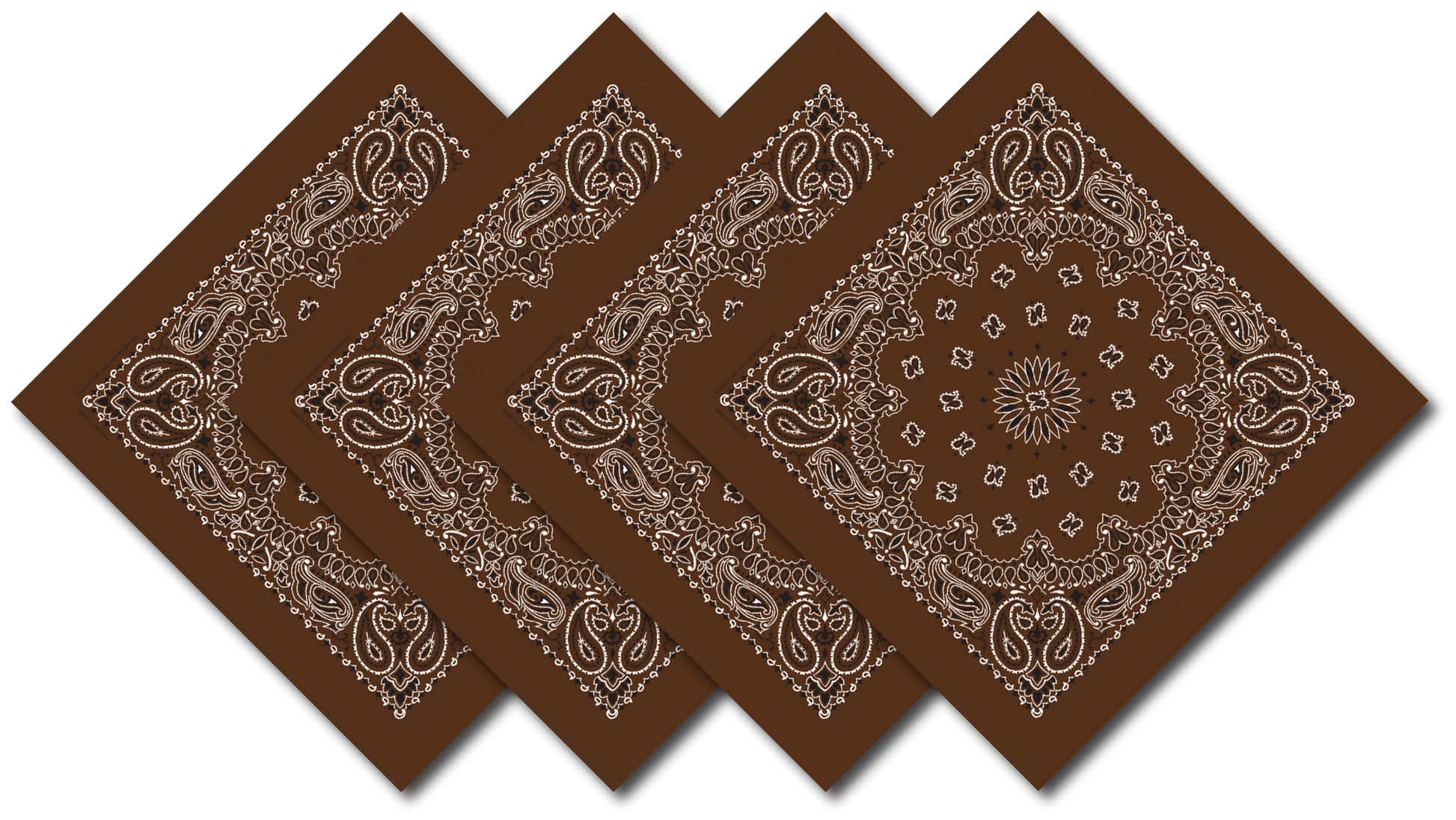 Earthy cocoa brown bandannas with paisley print. 4-pack of soft cotton, 22x22 size. Great for workwear, DIY, or style.