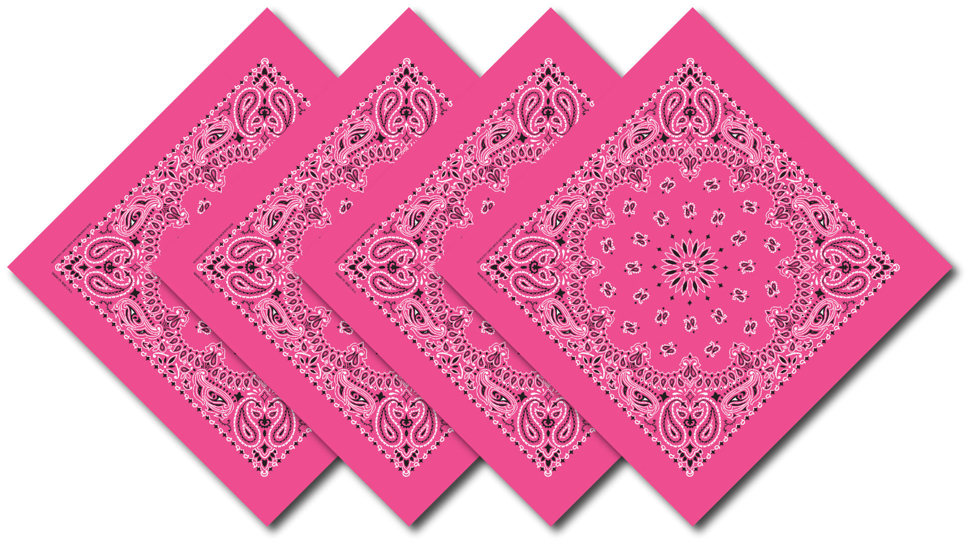 Bright fuchsia bandannas in a 4-pack, 100% cotton. 22x22 inch size, bold and fun for fashion, gifts, or events.