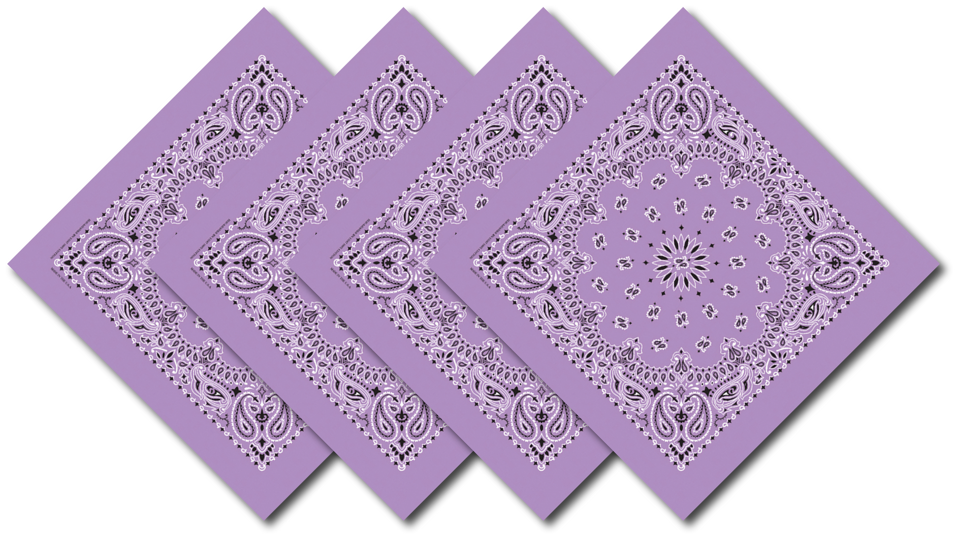 Soft lavender cotton bandannas in a 4-pack. 22x22 inch size. Light, wearable, and perfect for events or crafts.
