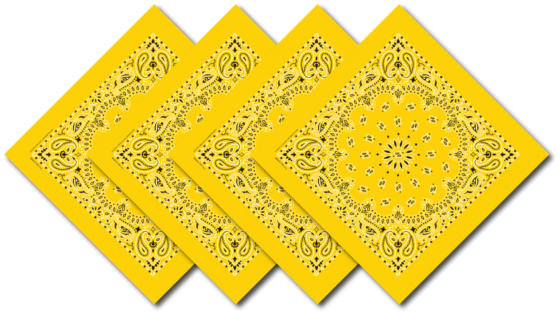Bright lemon yellow cotton bandannas in a 4-pack. Paisley printed, 22x22 inches. Ideal for fashion or sunny outdoor use.