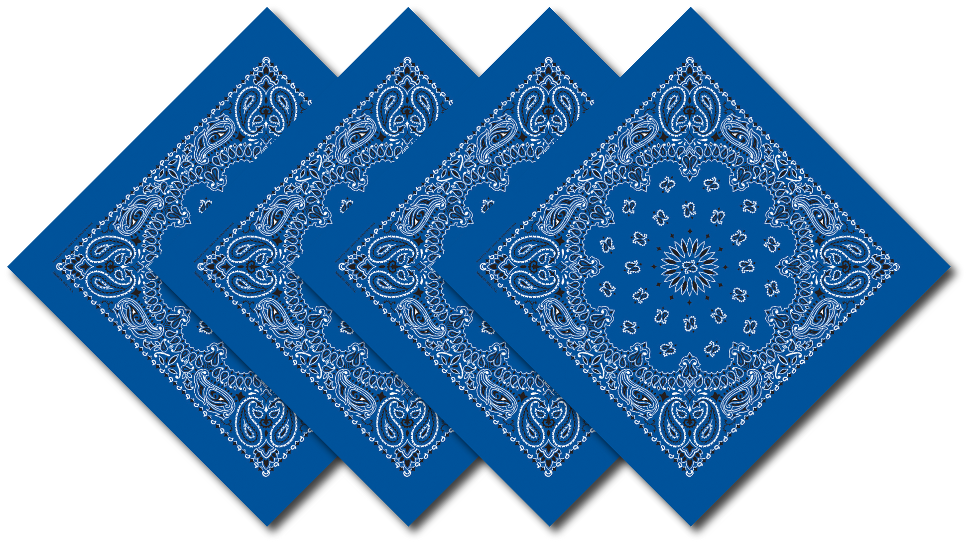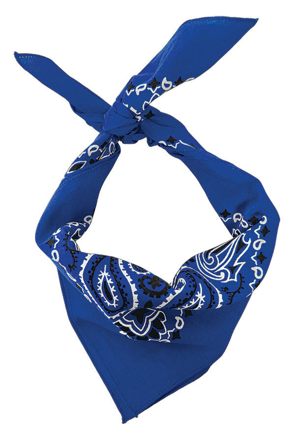 Strong royal blue cotton bandannas in a 4-pack. Classic paisley print, 22x22 inches, breathable and durable.